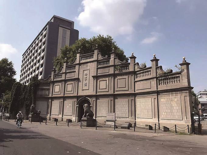 經(jīng)歷了100多年的風(fēng)雨滄桑,江南水師學(xué)堂的部分建筑依然保留了下來,以“江南水師學(xué)堂遺跡”之名被列為省級文物保護單位,現(xiàn)存當(dāng)年的英籍教官樓、四合院式寢室、講堂、半邊亭、長廊、牌樓式大門等建筑,另外還有“槍炮”“魚雷”等石刻門額。最為引人注目的是中山北路346號門前的那座牌樓式大門,平面呈圓弧形,立面均勻分布十根裝飾門柱。從門樓正中頂部開始,設(shè)有斜向兩側(cè)的層層退臺,共有五層,上面裝飾有具有動感的、巴洛克風(fēng)格的曲線漩渦花紋,旁邊一左一右還矗立著兩只威武的石獅。