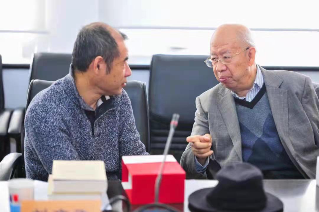 葉老師是9月27日6時離世的,這兩天,網(wǎng)上流傳著大量緬懷葉老師的文章和葉老師的遺文遺像。在漓江出版社推送的《深切緬懷:翻譯家、德語文學研究專家、卡夫卡研究專家葉廷芳先生》的文章中,我驚喜地看到了我與葉老師的一張合影。我之前沒有見過這張照片,拍攝地點是中國社科院外文所,時間是2018年12月,當時我和葉老師一起參加漓江出版社舉辦的《春潮漫卷書香永——開放聲中書人書事書信選》(劉碩良先生主編)出版座談會。照片上的葉老師抬起手,在對我說著什么。這可能是我與葉老師的最后一張合影。