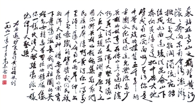 還有一條橫幅,是光年手書(shū)的《黃河頌》木版水印件。這是光年為慶祝由巴金任會(huì)長(zhǎng)的上海文學(xué)發(fā)展基金會(huì)成立而寫(xiě)的。全文200余字,一氣呵成,篇尾注明:右應(yīng)邀抄錄舊作黃河頌歌詞 一九九一年十二月光未然。有書(shū)法家說(shuō),這是他歷年所見(jiàn)光年書(shū)法中最好的一幅,筆筆蒼勁雄健,力透紙背,字字筆酣墨飽,神采飛揚(yáng),氣勢(shì)豪放,如黃河之水,洶涌澎湃,驚濤萬(wàn)丈。