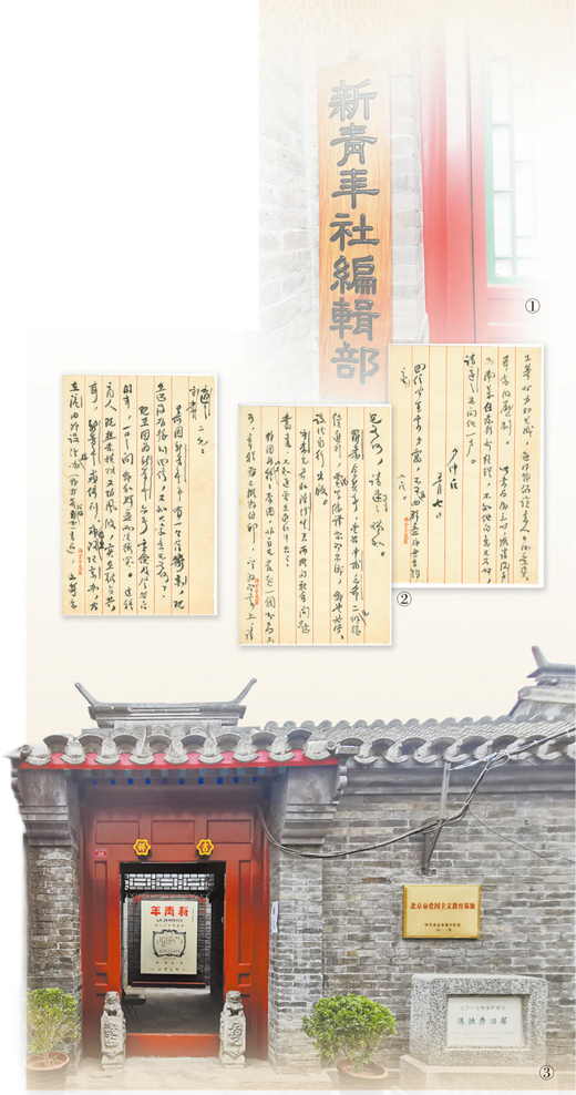 圖①:北京《新青年》編輯部辦公室;圖②:1920年5月7日陳獨(dú)秀致李大釗、胡適的信;圖③:北京《新青年》編輯部舊址大門。朱悅?cè)A、張丁供圖