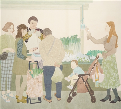 互聯(lián)網(wǎng)既為交通運(yùn)輸市場(chǎng)增添了活力,也顯著提升了人們?nèi)粘OM(fèi)的便捷度。像王琨中國(guó)畫《智享新生活》、盧沛中國(guó)畫《掃碼生活》等作品,均聚焦人們用手機(jī)掃描商鋪二維碼購(gòu)買蔬果的場(chǎng)景。移動(dòng)支付的便捷性在作品的小切口中體現(xiàn)得淋漓盡致。