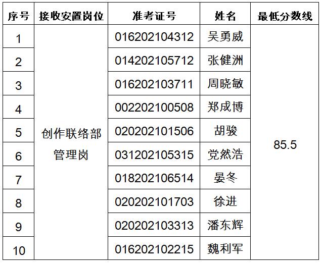 根據(jù)轉(zhuǎn)業(yè)軍官統(tǒng)考成績(jī),按接收崗位1:10的比例確定專業(yè)能力測(cè)試和面試人員。如有不能參加專業(yè)能力測(cè)試和面試的,按照統(tǒng)考成績(jī)從高到低的順序遞補(bǔ)。遞補(bǔ)人員名單不再另行公告,以電話通知為準(zhǔn)。各崗位專業(yè)能力測(cè)試和面試人員(按姓氏筆畫排序)、準(zhǔn)考證號(hào)及最低分?jǐn)?shù)線如下。