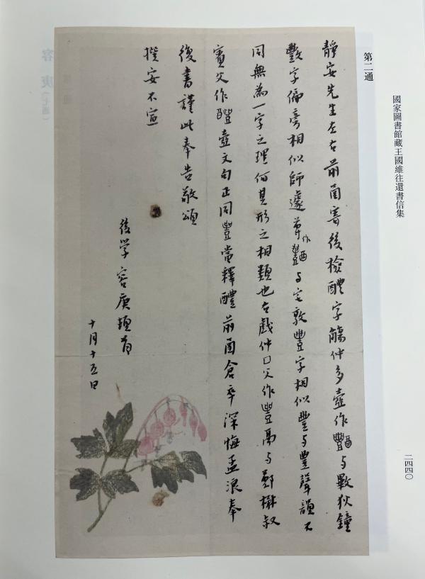 《未刊》(59-60頁(yè))沈致王函第一封(影印件見(jiàn)于《國(guó)圖》,2391-2393頁(yè)),從其內(nèi)容推斷,應(yīng)置于第二封之后。理由至少有以下數(shù)端:第一,函中有“《國(guó)學(xué)季刊》第二期本月中旬可以出版”云云,按第二期的出版日期是1923年4月,可見(jiàn)此函的時(shí)間應(yīng)在4月上旬。第二,有“沈子培先生遺稿前問(wèn)孟劬兄言已由先生擔(dān)任整理”云云,據(jù)《永豐鄉(xiāng)人行年錄》(《羅振玉學(xué)術(shù)論著集》第十二集,428-429頁(yè))所記:“十月三日,沈子培卒于滬,……靜安書(shū)言其遺著書(shū)眉及廢紙所記,頗可纂輯成數(shù)卷,其成書(shū)亦有數(shù)卷,詩(shī)文大致已有清本,合之可得二十卷。此事維當(dāng)任之……”可見(jiàn)此函必作于1922年10月上旬沈曾植先生過(guò)世之后。第三,沈氏函又提及“昨叔平兄由滬回京”,指的是馬衡先生在農(nóng)歷新年后由滬返京事。若此函確實(shí)作于1923年4月,那么馬衡先生“由滬返京”的時(shí)間也應(yīng)在該月。但是,《往來(lái)書(shū)信》(100頁(yè))1923年3月12日馬衡致王國(guó)維函說(shuō)“在滬晤教,甚快”,說(shuō)明馬衡在這一天之前已經(jīng)回京,至晚應(yīng)在3月上旬。兩種資料的日期出現(xiàn)了矛盾,有兩種可能,要么是沈致王函所說(shuō)《國(guó)學(xué)季刊》第2期的實(shí)際出版日期比馬氏在信中提到的時(shí)間晚了一個(gè)月,亦即預(yù)計(jì)是在1923年3月出版的,此函也作于當(dāng)月;要么是《往來(lái)書(shū)信》的這封馬致王函的時(shí)間3月12日為農(nóng)歷,公歷時(shí)間則為4月27日。一時(shí)難以遽定,姑記于此。
