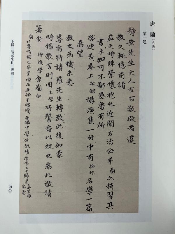 《未刊》(208-213頁(yè))收錄唐蘭致王國(guó)維函共五封。其中第一封(影印件見(jiàn)于《國(guó)圖》,2485頁(yè))未標(biāo)寫(xiě)信日期。唐先生在此函中說(shuō)道:“蘭于專(zhuān)修館已卒業(yè),頃在無(wú)錫羊腰灣無(wú)錫中學(xué)任教務(wù)?!碧铺m先生于1921年就學(xué)于無(wú)錫國(guó)學(xué)專(zhuān)修館,“師從唐文治,攻治小學(xué),漸及群經(jīng)”(唐復(fù)年、唐益年編《唐蘭年表》,嘉興市政協(xié)文史資料委員會(huì)編《嘉興文杰》,北京:當(dāng)代中國(guó)出版社2005年版,528頁(yè))?!?923年末,唐蘭在畢業(yè)考試中獲第一,時(shí)稱(chēng)‘國(guó)專(zhuān)三杰’之首”(《嘉興文杰》,485頁(yè)),其他兩位則是王蘧常和吳其昌。