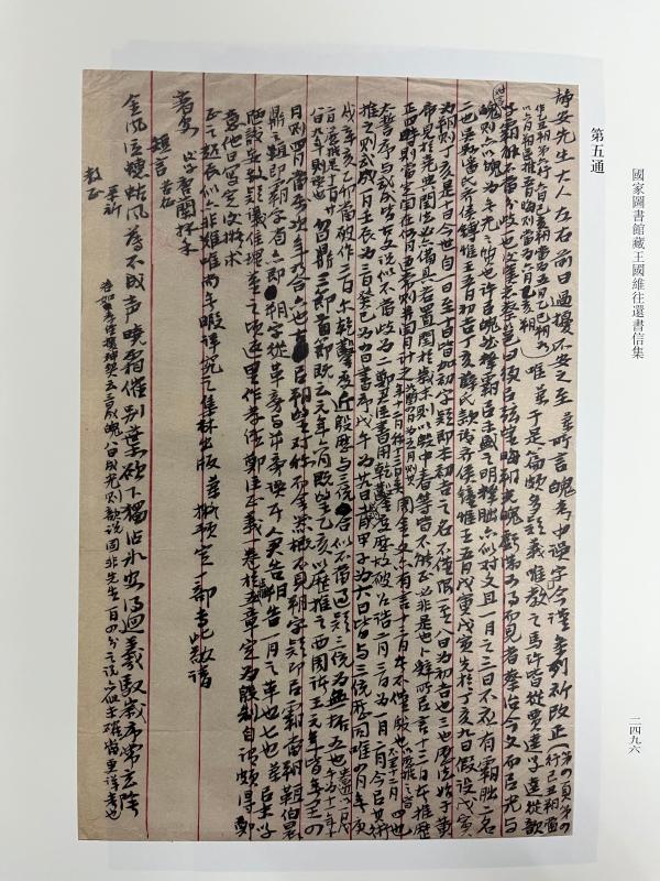 《未刊》(213頁(yè))唐致王函第五封(影印件見(jiàn)于《國(guó)圖》,2510頁(yè)),也沒(méi)有署寫(xiě)信時(shí)間。該函提及,唐蘭當(dāng)時(shí)正“頗留意小學(xué)”,并請(qǐng)教王氏唐寫(xiě)本《切韻》、蔣斧《唐韻》等韻書(shū)問(wèn)題。據(jù)《唐蘭全集》第十二冊(cè)(326-327頁(yè),1922年8月15日王致唐函,此函亦見(jiàn)于《書(shū)信日記》,679頁(yè)),據(jù)王國(guó)維先生對(duì)于唐氏“先治小學(xué),甚佩甚佩”及“唐寫(xiě)本《切韻》(系弟錄本)乃京師友人集資印之,以代傳寫(xiě)”,可知此函即為對(duì)唐致王函的回復(fù)。說(shuō)明此函應(yīng)作于1922年8月下旬前后。