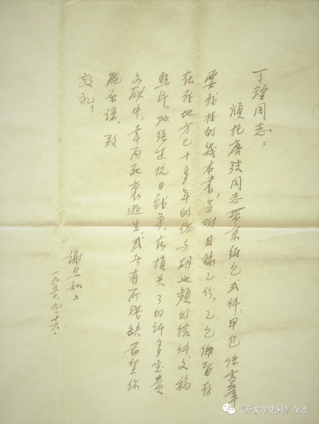 1950年,謝旦如曾經(jīng)送還給丁玲一批物品,我曾見過他9月16日致丁玲信: