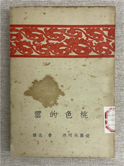 最早在1923年出版的《桃色的云》上,魯迅就采用古典圖案設(shè)計(jì)封面,該書(shū)是由他翻譯的愛(ài)羅先珂的童話集。封面上半部分采用漢代石刻的人物、禽獸及流云組成的帶狀裝飾,印紅色;封面下邊用宋體鉛字排寫(xiě)書(shū)名和作者名,印黑色。橘紅色的云紋和邊框錯(cuò)落有致,深沉又不失明艷,與黑色形成上下呼應(yīng)。整個(gè)封面設(shè)計(jì)緊扣童話《桃色的云》的主題,流露出對(duì)春之渴望及對(duì)自由的希冀。