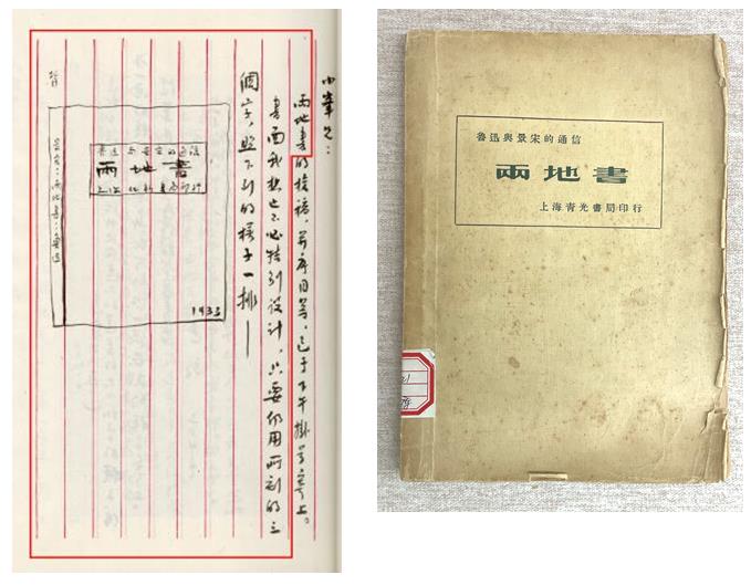 設(shè)計(jì)《兩地書(shū)》封面時(shí),魯迅在致李小峰的書(shū)信中手繪出了基本板式。長(zhǎng)方形框內(nèi)印綠色手寫(xiě)美術(shù)體書(shū)名,簡(jiǎn)單大方。