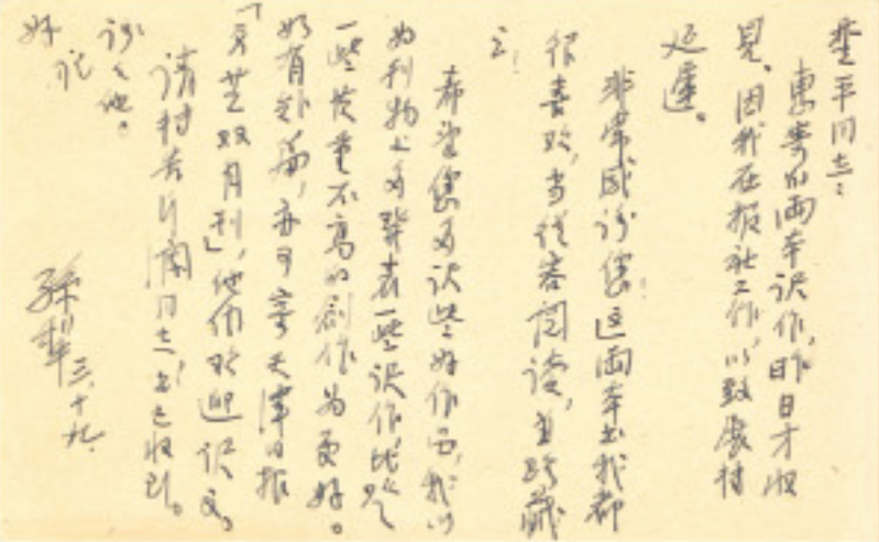 在《張中老,走好》一文的最后,林楚平說自己“在交友方面是十分差勁的”,一是認(rèn)路的本領(lǐng)太糟糕,其次“像汪曾祺、張老、孫犁這些作家原是有可能交往或保持通訊聯(lián)系的,但總覺得他們是文債纏身的大作家,給他們寫信就是打攪,也就怯于執(zhí)筆,聯(lián)系也就不能持久”。這方面的心理倒與我很相像。有意思的是,我同時還收藏了一枚孫犁先生1983年寫給林楚平的明信片,這也從另一個方面印證了林楚平上面的話。20世紀(jì)80年代后,孫犁先生給朋友寫信,基本都是用的郵資明信片。查閱山東畫報出版社1998年出版的孫犁著《蕓齋書簡》,大象出版社2004年出版的《蕓齋書簡續(xù)編》,以及人民文學(xué)出版社2004年版《孫犁全集》,都未收錄這通書簡,在此抄錄,以備后人加以輯佚研究: