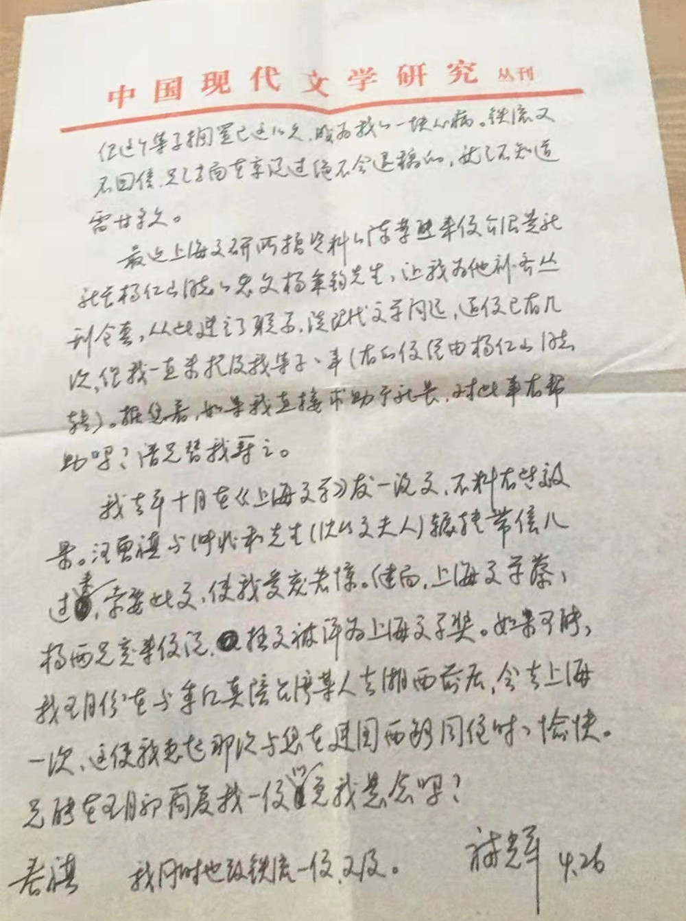 我去年十月在《上海文學(xué)》發(fā)一論文,不料有些效果。汪曾祺與張兆和先生(沈從文夫人)輾轉(zhuǎn)帶信兒過來,索要此文,使我受寵若驚。繼而,上海文學(xué)蔡、楊兩兄突來信說,拙文被評為上海文學(xué)獎。如果可能,我五月份在與季紅真陪臺灣某人去湘西前后,會去上海一次,這便使我想起那次與您在建國西路同住時的愉快。兄能在五月初簡 復(fù)我一信以免我懸念嗎?