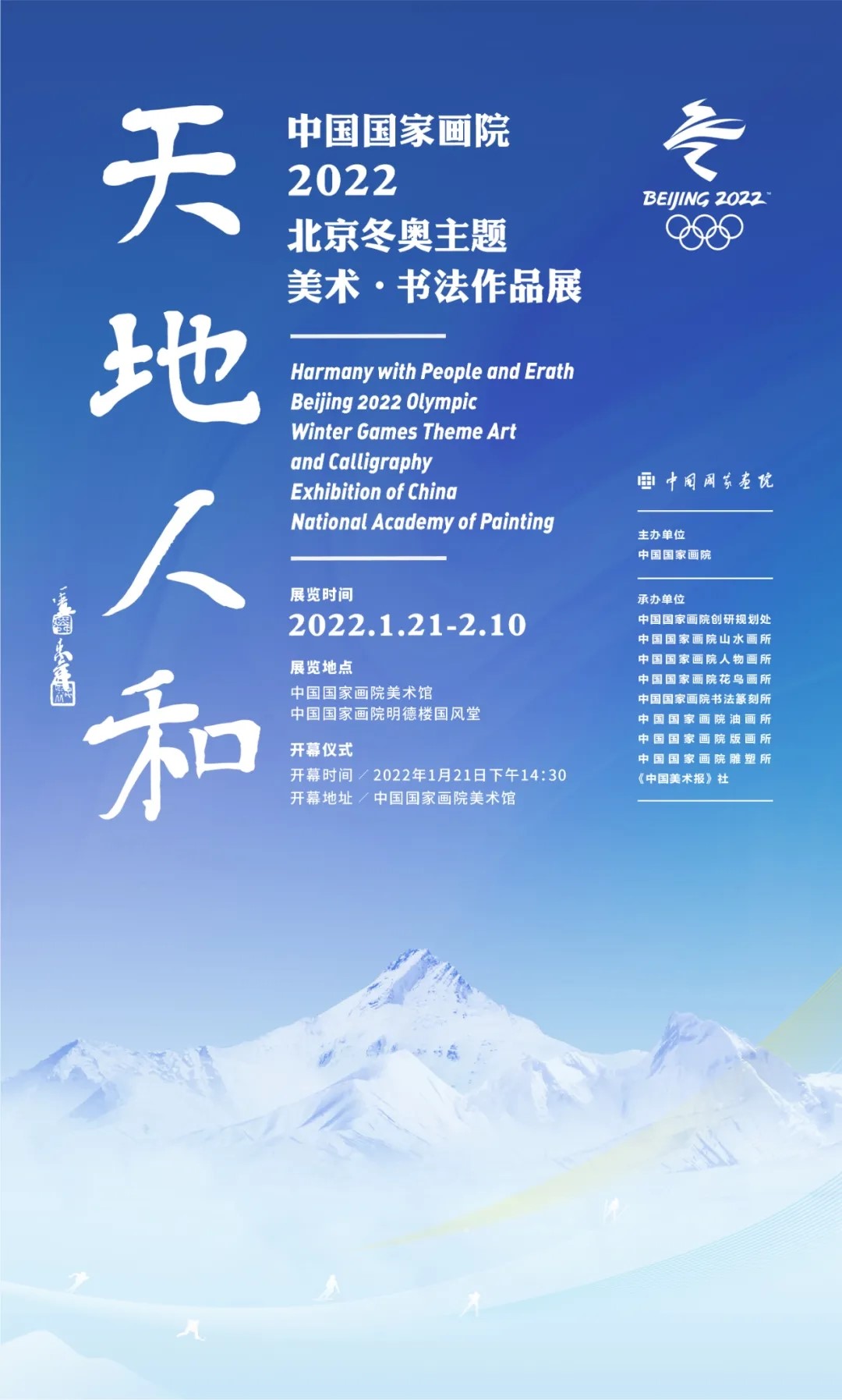 1月21日,由中國國家畫院主辦,中國國家畫院創(chuàng)研規(guī)劃處、山水畫所、人物畫所、花鳥畫所、書法篆刻所、油畫所、版畫所、雕塑所、中國國家畫院美術(shù)館、《中國美術(shù)報》社承辦的“天地人和——中國國家畫院2022北京冬奧主題美術(shù)·書法作品展”在中國國家畫院美術(shù)館開幕?!疤斓厝撕汀笔侵袊鴤鹘y(tǒng)文化中天人合一思想的精髓,展覽以此為主題,正契合了冬奧“綠色生態(tài)可持續(xù)”的人文理念。