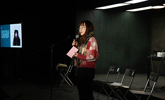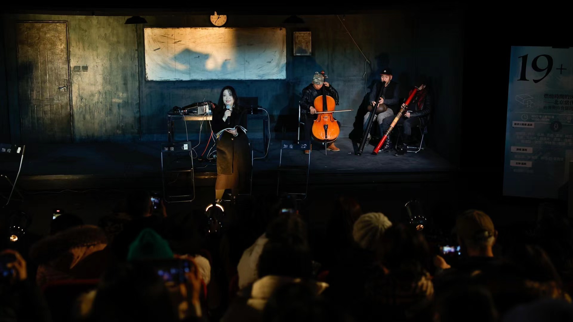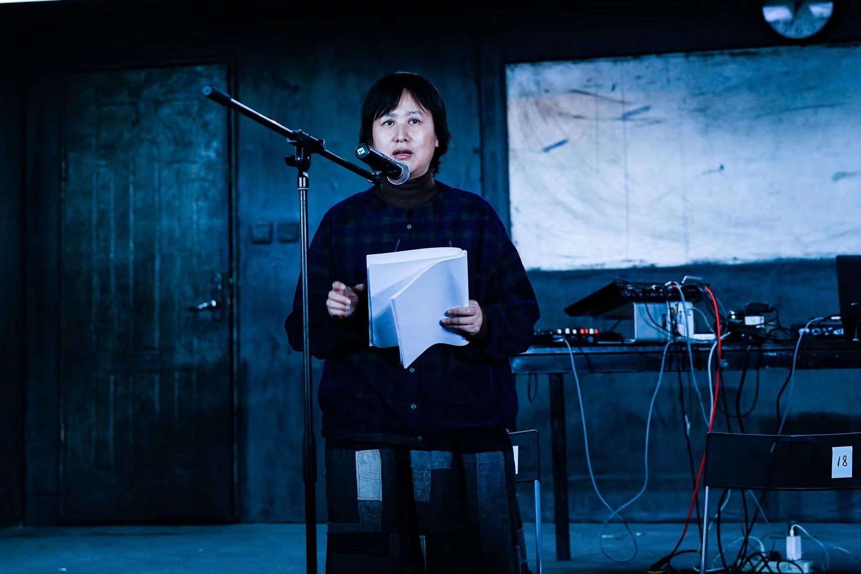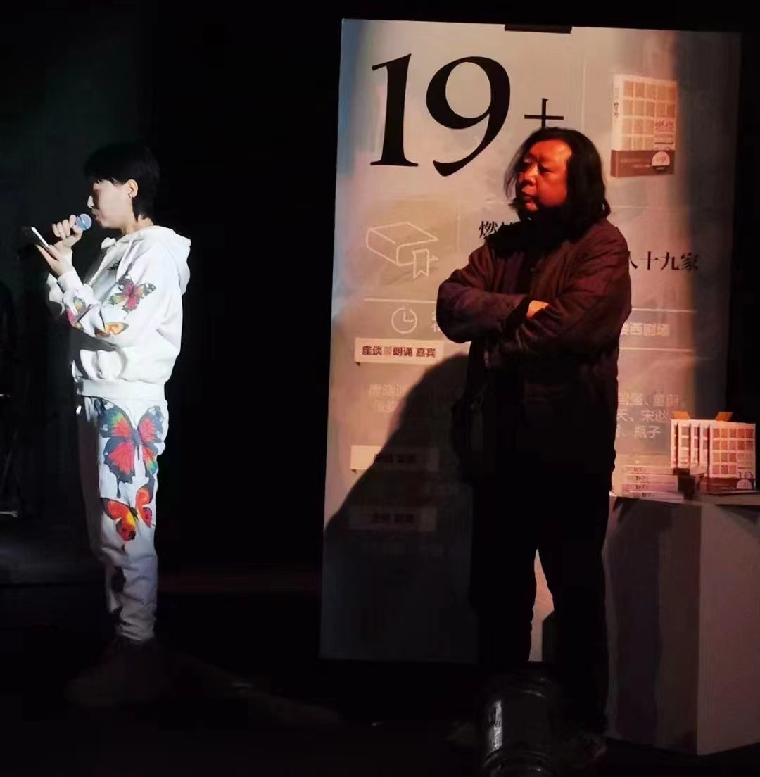 音樂人Gia Wang朗誦詩人宋逖作品時,詩集編者老賀在臺側(cè)沉思