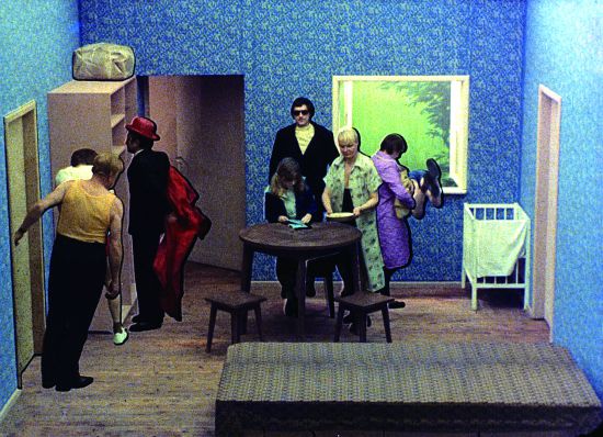 根據(jù)瑞比克金斯基的公司官網(wǎng)資料顯示,為了創(chuàng)作《探戈》,他花費(fèi)了大量精力進(jìn)行人工逐幀處理——手動摳像,再手動合成。這難免會使這部短片的視覺效果有一定瑕疵。瑞比克金斯基自己坦言,人物周圍有可見的黑色邊線,膠片材料的不穩(wěn)定也導(dǎo)致了抖動,燈光色溫的波動影響了顏色的統(tǒng)一。為了讓36個人的行動軌跡在狹小的房間里互不影響,瑞比克金斯基對人物的姿態(tài)序列在時間軸上進(jìn)行了微調(diào),于是《探戈》最后呈現(xiàn)出角色動態(tài)有時略快、有時略慢的狀況。也正因為這個原因,雖然筆者更愿意將其歸為以實拍為基底的作品,但畢竟它踩在了動畫與實拍兩種影像類別的邊線上——瑞比克金斯基自己甚至將其稱作“實拍動畫”(live action animation)這種怪名字——因此在這里我們不妨以動畫視角來審視該短片。