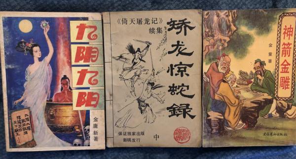 在我翻看挑選得起勁時,老板娘突然說了句:“有幾本錯版的書要不要?很難找的!”我問:“什么是錯版?”老板娘便解釋給我聽,以前的書商為了那些在香港、臺灣地區(qū)流行的武俠作家進大陸市場賣得好,把他們名字大部分改為了金庸、古龍、梁羽生,比如司馬翎是上世紀八十年代被改最多的臺灣作家,還有蕭逸、臥龍生、陳青云、柳殘陽、上官鼎也多是被改名引進的,這些錯版的書在后來的1990年代因為版權正規(guī)化后便絕版不再印制了,如今卻成了武俠愛好者搜尋收藏的對象。另外,還有取名“金庸新”、“金庸巨”甚至“金庸著”之類騙讀者掏錢的,就像現在許多商業(yè)大片被抄襲翻拍成的B級片,當然也有金童改編《射雕英雄傳》的前傳后傳《神箭金雕》與滄浪客的續(xù)寫金庸古龍系列之類的良心之作。