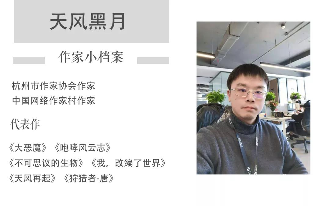 天風(fēng)黑月,杭州市作家協(xié)會(huì)作家,中國網(wǎng)絡(luò)作家村村民,憑借其獨(dú)特的“腦洞”吸引了無數(shù)忠實(shí)讀者,代表作有《大惡魔》《咆哮風(fēng)云志》《不可思議的生物》《我,改編了世界》《天風(fēng)再起》《狩獵者-唐》等。