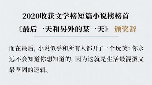 《最后一天和另外的某一天》獲得了2020年收獲文學(xué)榜短篇小說(shuō)榜榜首,書寫的是一個(gè)女殺人犯的故事。一個(gè)女人在監(jiān)獄里待了整整十七年,成為了監(jiān)獄里的頭號(hào)模范犯人。這個(gè)女人身上到底發(fā)生了什么樣的故事?對(duì)這個(gè)問(wèn)題的探尋一直貫穿于我們的閱讀體驗(yàn)中。收獲文學(xué)榜頒獎(jiǎng)辭對(duì)小說(shuō)的理解是這樣的:“小說(shuō)試圖窺探這個(gè)女人謎一樣的人生,卻發(fā)現(xiàn)終究所得有限。在不得已的情況下,小說(shuō)設(shè)置了戲中戲,一部以此女人為原型的戲劇在舞臺(tái)上演,作為原型的女人坐在觀眾席里冷若冰霜。這是作家和他作品中人物的角力,在這個(gè)意義上,艾偉的這篇小說(shuō)帶有“元小說(shuō)”的氣質(zhì),因此小說(shuō)有兩個(gè)文本面向,在表層文本里,女犯人的故事以懸疑劇的方式勾起了讀者足夠多的好奇心;在深層文本里,這是一個(gè)關(guān)于作家無(wú)法馴服其作品人物的故事,它暗示了藝術(shù)的高度和限度。而在最后,小說(shuō)似乎和所有人都開了一個(gè)玩笑:你永遠(yuǎn)不會(huì)知道你想知道的,因?yàn)檫@就是生活最混蛋又最堅(jiān)固的邏輯。”《最后一天和另外的某一天》寫了不可理解之理解,因而深不可測(cè)。