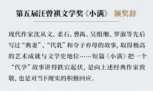 《小滿》講了女性母愛本能和身體的關(guān)系,獲得第五屆汪曾祺文學(xué)獎(jiǎng)。小說(shuō)講述的是一個(gè)關(guān)于代孕的故事,塑造了女主人公小滿、古董商人白先生、白太太、女傭喜妹這幾個(gè)人物形象。白先生外表斯文,內(nèi)心卻藏著不可告人的秘密;白太太表面平易近人,但也有毫不留情的時(shí)刻;傭人喜妹對(duì)主人家忠心耿耿,卻更顯“奴性”,而作為代孕母體的主人公小滿在這場(chǎng)倫理悲劇中,由天真善良變得瘋瘋癲癲。艾偉將故事講得跌宕起伏,讓人物自由生長(zhǎng)于文字之間,也回應(yīng)了當(dāng)代的社會(huì)現(xiàn)實(shí)問(wèn)題。汪曾祺文學(xué)獎(jiǎng)給《小滿》的頒獎(jiǎng)辭強(qiáng)調(diào)了小說(shuō)的現(xiàn)實(shí)意義:“你若非喜妹,將如何看待類似的代孕故事?作者的追問(wèn)難以回避,小說(shuō)的撼人力量正由此而來(lái)?!?/p>