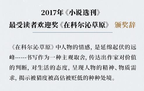 《在科爾沁草原》講述男女之間不可言說(shuō)的復(fù)雜和曖昧,獲2017年《小說(shuō)選刊》最受讀者歡迎獎(jiǎng)。頒獎(jiǎng)辭中寫道,“《在科爾沁草原》中人物的情感,是延綿起伏的遠(yuǎn)峰。故事情節(jié)作為“冰山的水上部分”,由富有意味的一系列變化構(gòu)成。這些外在的變化帶來(lái)轉(zhuǎn)折的詫異,也體現(xiàn)人物的內(nèi)在訴求。書寫作為一種主觀取舍,傳達(dá)出作家對(duì)價(jià)值的判斷,對(duì)生活的態(tài)度,呈現(xiàn)人物的精神、物質(zhì)需求,揭示被猜度被高估被貶低的種種處境?!?/p>