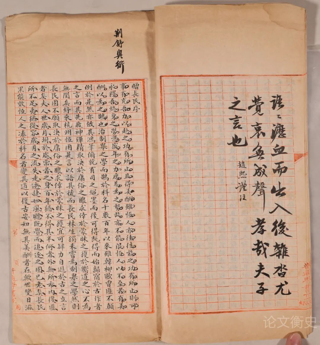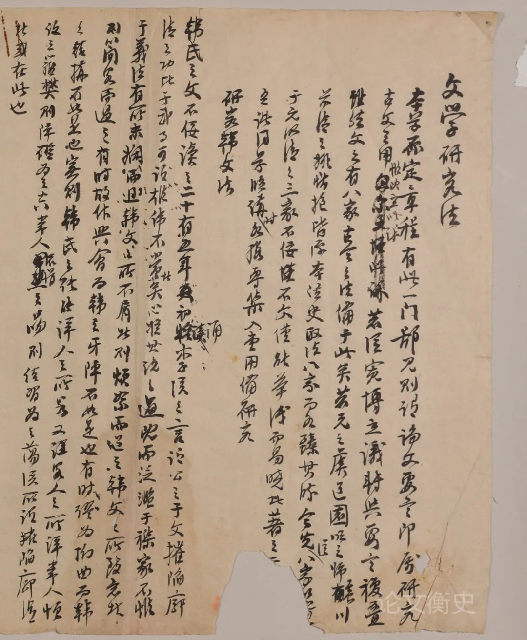 初見此稿,便覺眼熟。正文部分列出小標(biāo)題“研究韓文法”,以下第一則“韓氏之文,不佞讀之二十有五年”,至所書最后一則“《諱辯》一首,已見之‘文章流別’”,經(jīng)檢出自藏之《韓柳文研究法》對照,此九條果然一般無二。最為難得的是,手稿篇首尚多出一段低三格書寫的引言,先全錄如下(因原稿破損而有闕字),再做解說:
