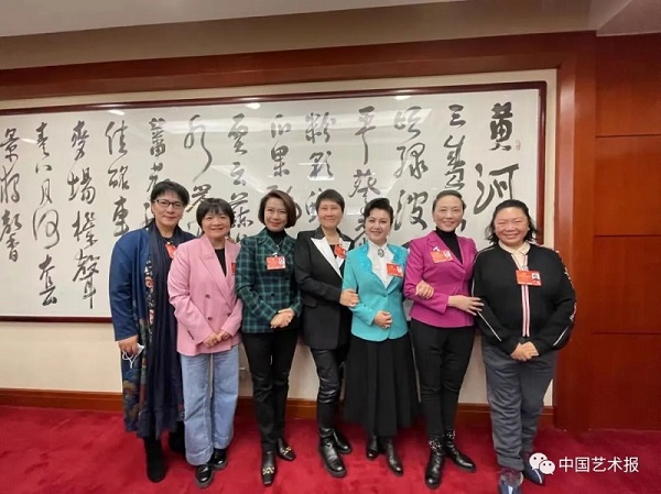 左起:全國政協(xié)委員、全國三八紅旗手、云南省文聯(lián)副主席宗庸卓瑪,全國政協(xié)委員、中國視協(xié)副主席王麗萍,全國政協(xié)委員、北京京劇院青年團(tuán)團(tuán)長、京劇表演藝術(shù)家遲小秋,全國政協(xié)委員、國家話劇院一級(jí)演員張凱麗,全國政協(xié)委員、中國文聯(lián)副主席、中國舞協(xié)副主席、新疆舞協(xié)主席迪麗娜爾·阿布拉,全國政協(xié)委員、民進(jìn)中央文化藝術(shù)專委會(huì)副主任、中國歌劇舞劇院原副院長徐麗橋,全國政協(xié)委員、中國國家話劇院院長田沁鑫
