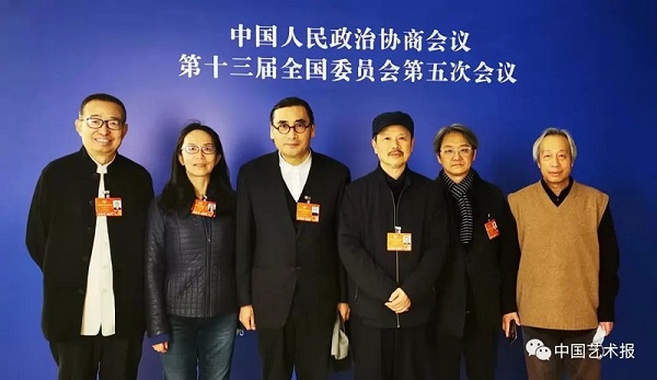 左起:全國政協(xié)委員、中國文聯(lián)副主席、中國民協(xié)主席潘魯生,全國政協(xié)委員、天津美術(shù)館副館長盧永琇,全國政協(xié)委員、中國藝術(shù)研究院國畫院副院長、中國國家博物館副館長劉萬鳴,全國政協(xié)委員、中國藝術(shù)研究院國畫院名譽(yù)院長田黎明,全國政協(xié)委員、北京畫院院長吳洪亮,全國政協(xié)委員、中國藝術(shù)研究院國畫院院長??苏\