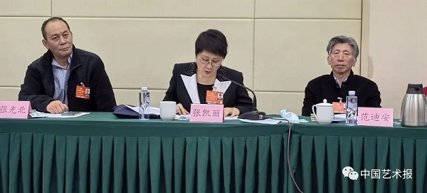 全國政協(xié)委員、中國電影表演學(xué)會(huì)秘書長張光北(左),全國政協(xié)委員、國家話劇院一級(jí)演員張凱麗,全國政協(xié)委員、中央美術(shù)學(xué)院院長、中國美協(xié)主席范迪安(右)