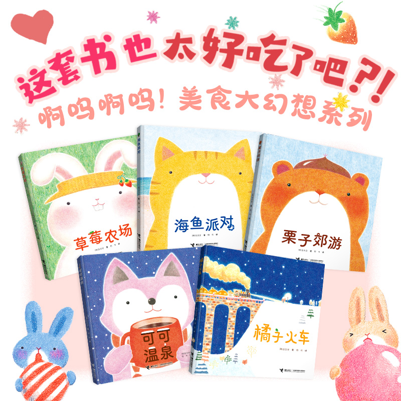 春天,小兔子們運送草莓時,火山把草莓變成了草莓醬;夏天,小貓咪們出海打魚時,被大鯨魚甩到了海島上,但他們也收獲了意外的美食;秋天,小松鼠們摘板栗的時候,一道雷打下來,不僅把樹頂最大的板栗打了下來,還把它烤熟了;冬天,小狐貍們去滑雪的時候背了一罐可可粉,他們不小心摔進了溫泉里,結果收獲了一整個溫泉的熱可可;另外,在冬天里,還有一趟神奇的橘子火車,載著小女孩美娜駛向了神奇的橘子小鎮(zhèn)……這套充滿幻想的美食圖畫書,能讓孩子食欲大增,也能幫助孩子發(fā)散思維,放飛想象力。