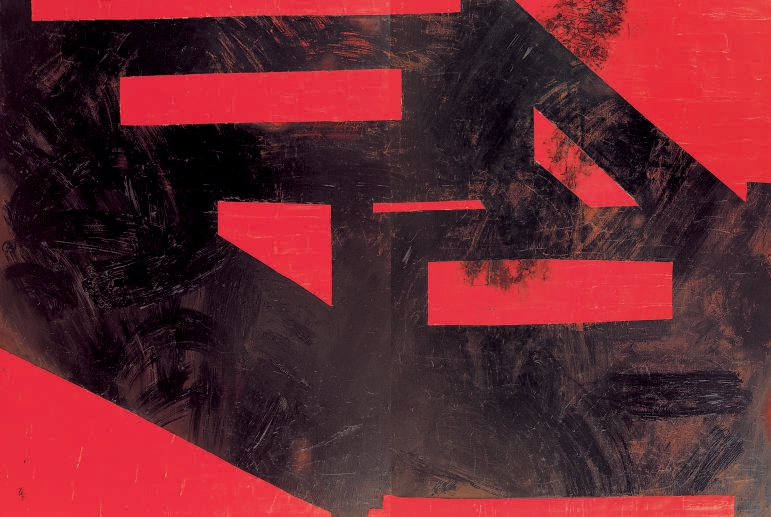 1999年至2003年之間,《直角》《椅子和椅子》《某年某月某日》《自己和自己的影子》《行》《四合》《紅》等一批作品接連問世。人們在這批作品中已經看不到王懷慶曾經過硬的速寫功底、塑造人物的肖像能力以及唯美而簡淡的詩境,只留下更加冷峻理性的圖式與筆觸。這些“物形”被解構的畫面讓觀眾直接越過客體,進入交錯線條節(jié)奏與結構的審美,引發(fā)對人與天、人與地、人與人、人與己四合關系的深層思考。王懷慶試圖給這個紛亂世界以秩序的力量。