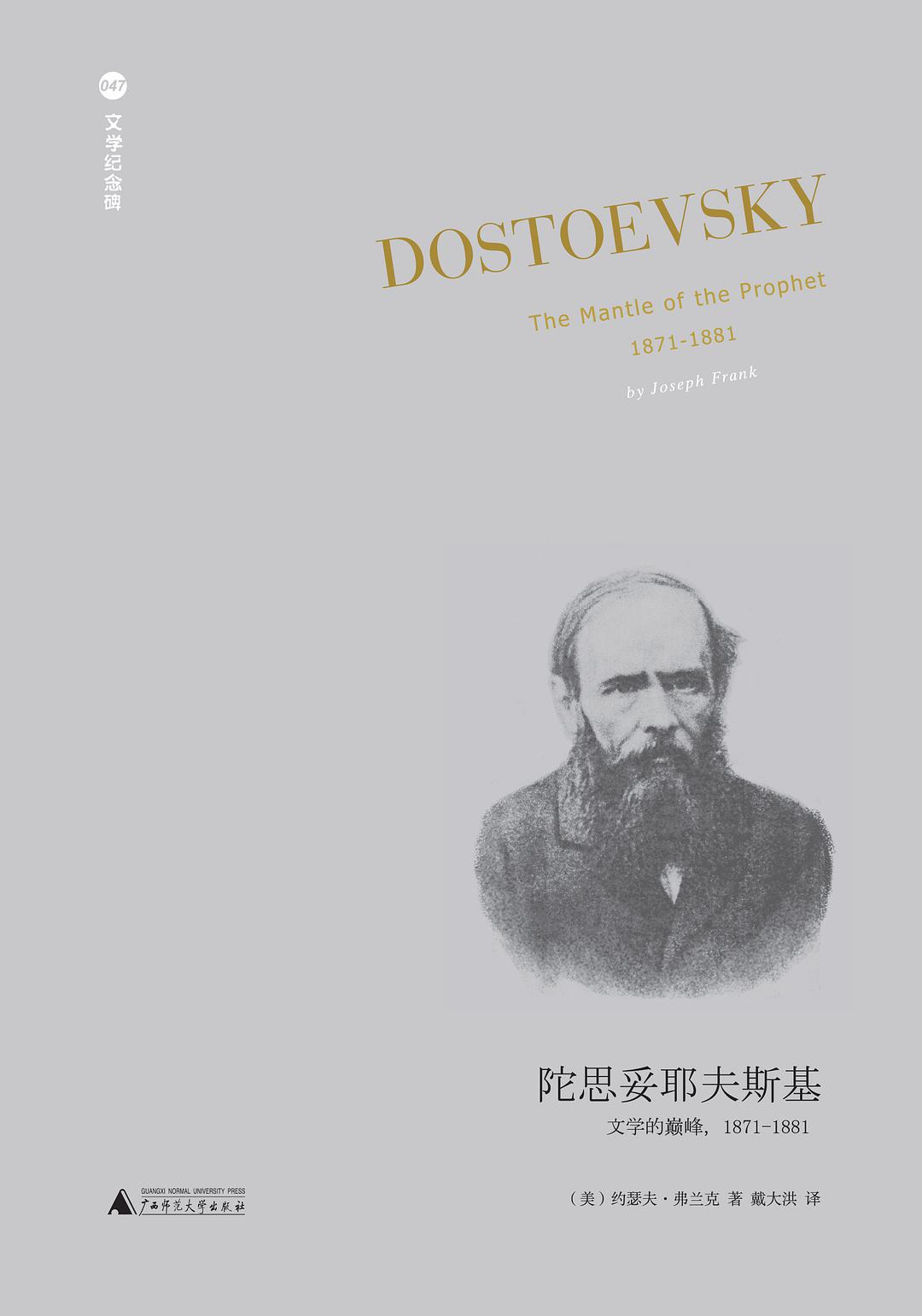 廣西師范大學出版社的“文學紀念碑”叢書(魏東主持)于2014年推出約瑟夫·弗蘭克的五卷本《陀思妥耶夫斯基》傳記,最后一卷是《陀思妥耶夫斯基:文學的巔峰,1871-1881》(原書名Dostoevsky:The Mantle of the Prophet,1871 -1881,2002;戴大洪譯,廣西師范大學出版社,2022年3月)。煌煌五大卷、總共近四千頁的陀思妥耶夫斯基傳記,可以不夸張地說,這是“文學紀念碑”中那座最宏偉的碑,是文學與思想、理想與信仰之間最深邃的幽谷,其意義遠超出一般的文學翻譯出版項目。