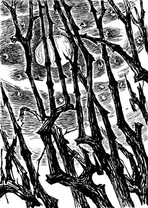 與“低亞著”的“幾枝”相比,“最直最長(zhǎng)的幾枝”卻呈現(xiàn)出另外的形態(tài),且與“天空”構(gòu)成了尖銳的對(duì)峙:“默默地鐵似的直刺著奇怪而高的天空,使天空閃閃地鬼?眼;直刺著天空中圓滿的月亮,使月亮窘得發(fā)白?!?/p>