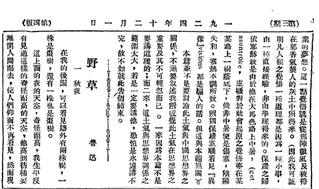 《野草·秋夜》初刊本,《語(yǔ)絲》第三期第四版,1924年12月1日