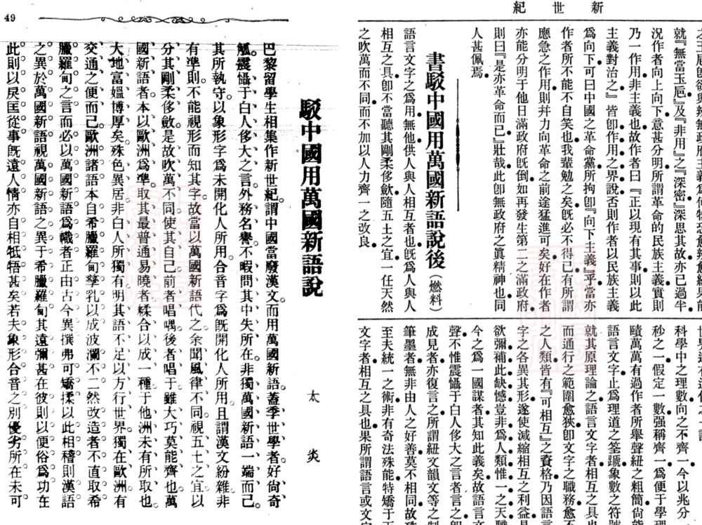 1908年,章太炎和吳稚暉等人就“萬(wàn)國(guó)新語(yǔ)”問題展開論戰(zhàn),圖為章太炎《駁中國(guó)用萬(wàn)國(guó)新語(yǔ)說》和吳稚暉《書駁中國(guó)用萬(wàn)國(guó)新語(yǔ)說后》,分別發(fā)表于該年《民報(bào)》21期和《新世紀(jì)》第57期
