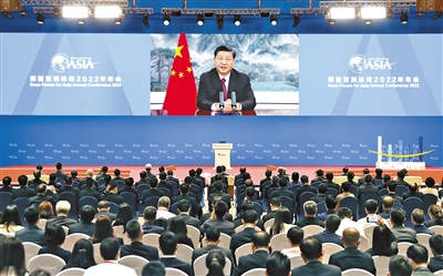 4月21日上午,博鰲亞洲論壇2022年年會(huì)開幕式在海南博鰲舉行,國家主席習(xí)近平以視頻方式發(fā)表題為《攜手迎接挑戰(zhàn),合作開創(chuàng)未來》的主旨演講。 新華社記者 丁海濤攝