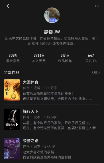 打開起點(diǎn)中文網(wǎng)的體育小說(shuō)頻道,在《大國(guó)體育》的單章里,你可能會(huì)讀到這樣的“請(qǐng)假條”。在作者靜物的介紹欄里寫著“作者身體抱恙,仍堅(jiān)持每天更新”。