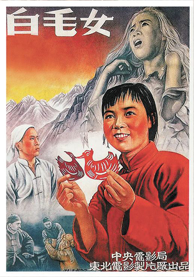 電影《白毛女》海報由享有“海報泰斗”之譽(yù)的顏地先生繪制,是一幅水粉畫。海報對比鮮明,濃縮了影片精華。畫面前景為暖色調(diào),喜兒身穿紅色棉襖、手拿自己剪的一對紅色鴛鴦窗花,紅潤的臉龐笑容洋溢,還有一頭烏黑亮麗的秀發(fā),整個人活潑可愛。背景則為冷色調(diào),從雪山洞窟出來的“白毛仙姑”披頭散發(fā),雙手回抱在肩,口張大、眉頭緊鎖,表情痛苦。冷色調(diào)與暖色調(diào)、黑頭發(fā)與白頭發(fā)、可愛與恐怖,這種對比的手法,深刻揭示出“舊社會把人逼成‘鬼’,新社會把‘鬼’變成人”的主題,給觀眾留下強(qiáng)烈的心靈震撼。