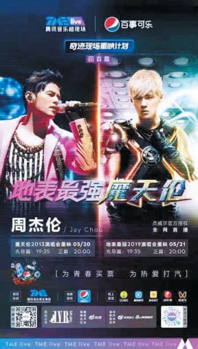 崔健演唱會和周杰倫演唱會重映的商業(yè)模式十分典型。前者由著名車企贊助,后者由騰訊音樂娛樂集團推出,而騰訊音樂也正好是周杰倫在線音樂播放的版權(quán)方。對于在線音樂平臺來說,誰擁有了版權(quán),誰就擁有“大秀肌肉”的權(quán)力。除了騰訊的加持,某飲品廠商的標志也始終出現(xiàn)在重映的屏幕上,作為贊助方顯示了極強的存在感。