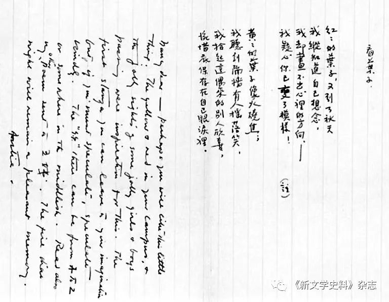 Nancy dear——Perhaps you will like this little thing. The yellow & red in your campus, & the jolly sighting some jolly girls & boys passing were inspiration for this. The first stanza you can leave to your imagination but if you must speculate, speculate kindly. The“你”there can be from A to Z or somewhere in the middlish. Read also my other poem sent to 五姨.⑥The fire chat night will remain a pleasant memory.