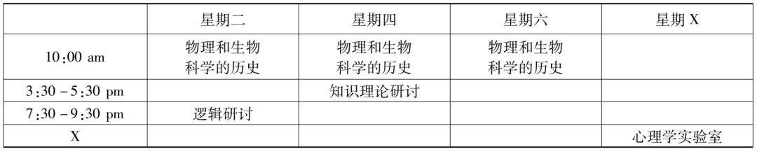 而“哲學23a2號課”的課名是“哲學方法”(philosophic method),依然是協(xié)佛開的課。它是大類課程“哲學23號課”(Philosophy 23)的分支課,“哲學23號課”之總名為“知識理論”(theory of knowledge),其目標是對與知識的方法、效度(validity)和限度(limits)有關(guān)的一些基本問題進行邏輯分析。這七門課程中,兩門科學史課程和“哲學中的實用主義運動”是通修課,余下的其他課程則全是研究生基礎(chǔ)課。趙元任這個學年的課程表(見表4、表5)也可以通過綜合這些課程的上課時間重新列出。