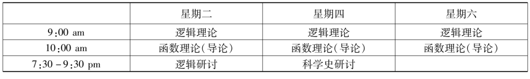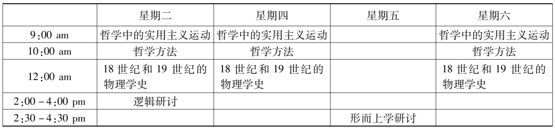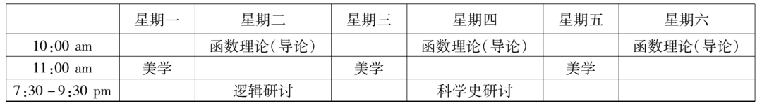 在哈佛大學學習的三年,趙元任每年都修了“邏輯研討”課程。1916至1917學年,此課的主題是“哲學技巧領(lǐng)域中多種科學方法的問題”(problems in philosophical techniques, of various scientific method),顯然是對上個學年課程內(nèi)容的延續(xù)。不過,課程主持人換成了韓德森和協(xié)佛。若伊思于1916年9月,新學年開啟之際,溘然長逝。趙元任本學年上學期另外上的一門邏輯課——“邏輯研究”,是由侯恩雷(R. F. A. [Reinhold Friedrich Alfred] Hoernlé)講授的,內(nèi)容是對邏輯學和認識論的理論進行比較研究(a comparative study of logic and epistemological theories),尤其是針對布拉德利(Francis H. Bradley)和鮑??˙ernard Bosanquet)的著作,也還會參考羅素(Bertrand Russell)、胡塞爾(Edmund Husserl)和邁農(nóng)(Alexius Meinong)的著作。這些哲學家那時都尚未過世,正聲名顯赫。這個課看起來與趙元任已修過的“知識理論研討”一課有承接關(guān)系,但估計有些難度,特別是對本科生而言,因為課程特別說明了,選這課的學生需做好充足的準備。趙元任這一年修的“科學史研討”課程由薩頓主持,圍繞“物理科學的歷史”(history of the physical sciences)展開,目標是基于數(shù)理科學(mathematical and physical sciences)的歷史,對其根本的原則和理論進行分析與討論,還會就其來源進行比較研究。修這課并不需要先掌握高深的科學知識,因為課程研究的每個概念或想法都將針對特定的問題,從最初的起點進入。除了“美學”是通修課,“函數(shù)理論(導論)”“邏輯研討”“邏輯理論”“科學史研討”均是研究生基礎(chǔ)課。結(jié)合這五門課的時間信息,由此,趙元任1916至1917學年的課程表(見表2、表3)亦得再現(xiàn)。