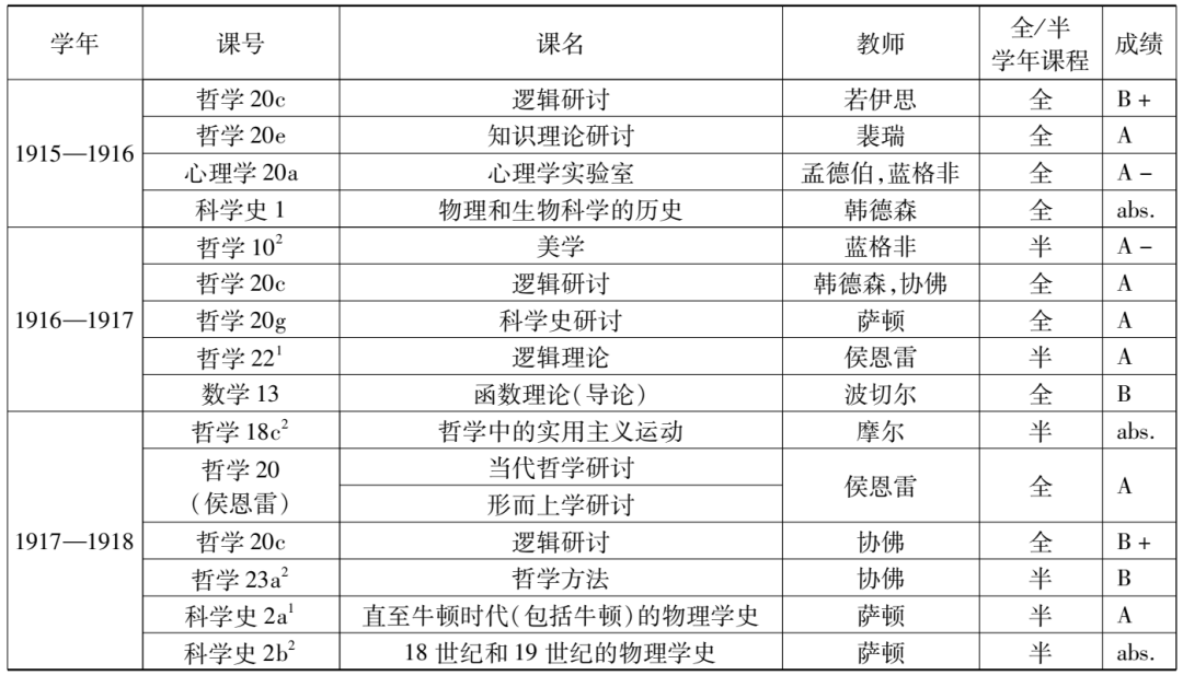 在哈佛大學學習的最后一個學年——也是受教育生涯的最后一年,趙元任修的課最多,共有六門,包括了兩門科學史課程,即“科學史2a1號課”(History of science 2a1)——名為“直至牛頓時代(包括了牛頓)的物理學史”(history of physics to [and including] Newton)的課程和“科學史2b2號課”——名為“18世紀和19世紀的物理學史”(history of physics in the eighteenth and nineteenth centuries)的課程。兩門課均由薩頓所講授,內(nèi)容是物理學的進步與文明進步之間的關(guān)系,其實它們是連貫一體的,只是針對的時代有先有后而已,且一門是上學期的課,另一門是下學期的課。另外的四門課則是“哲學18c2號課”(Philosophy 18c2)、“哲學20c號課”、“哲學20號課(侯恩雷)”(Philosophy 20 [R.F.A.H])和“哲學23a2號課”(Philosophy 23a2)。其中,“哲學20號課(侯恩雷)”所表示的有可能是“哲學20a2號課”(Philosophy 20a2)或“哲學20k1號課”(Philosophy 20k1)——它們均由侯恩雷講授,但是,更可能是兩門課的結(jié)合體。因為在趙元任的哈佛成績單上,“哲學20號課(侯恩雷)”是一個全學年課程,故而并非“哲學20a2號課”或“哲學20k1號課”這樣的半學年課程;而在1917至1918學年,“哲學20號課”的分支課程中并無侯恩雷開的全學年課程——侯恩雷只在上、下學期分別有唯一的半學年課程置于“哲學20號課”名下。也就是說,趙元任這個學年實際修了七門課,即全學年課程“哲學20號課(侯恩雷)”分作了兩門半學年課程:“哲學20a2號課”——“形而上學研討”(seminary in metaphysics)和“哲學20k1號課”——“當代哲學研討”(seminary in contemporary philosophy)。前者以“理念論與新實在論的形而上學”(the metaphysics of idealism and neo-realism)為主題。后者的主題則是“邁農(nóng)的《論假設(shè)》”(Meinong’s Uber Annahmen),這門課有特殊的語言要求——能讀懂德語。邁農(nóng)是奧地利哲學家,以德語寫作,而趙元任早年在江南高等學堂預科便學過德語,進入康納爾大學后,德語學習亦未輟,因此,完全有能力修讀此課?!罢軐W18c2號課”的課名是“哲學中的實用主義運動”(the pragmatic movement in philosophy),內(nèi)容是“實用主義運動的邏輯學、形而上學和社會方面”(logical, metaphysical and social aspects of the pragmatic movement),每周有三節(jié)課:兩個講座和一個討論會(section meeting)。這門課是由芝加哥大學的教授摩爾(Addison W. Moore)來主持的。這一學年的“邏輯研討”課程由協(xié)佛一人主持,針對特定的邏輯學主題展開,尤其是討論了那時哲學界最關(guān)注的邏輯學問題。
