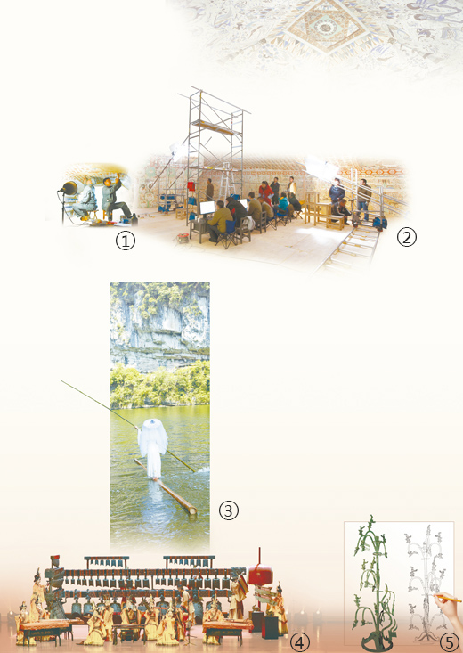 圖①圖②:敦煌研究院團(tuán)隊(duì)在進(jìn)行壁畫修復(fù)和洞窟數(shù)字化信息采集。 敦煌研究院供圖 圖③:楊柳獨(dú)竹漂表演。 楊 柳供圖 圖④:湖北省博物館編鐘樂團(tuán)演出現(xiàn)場(chǎng)。 馬業(yè)平供圖 圖⑤:三星堆出土的青銅神樹及考古繪圖。 三星堆博物館供圖