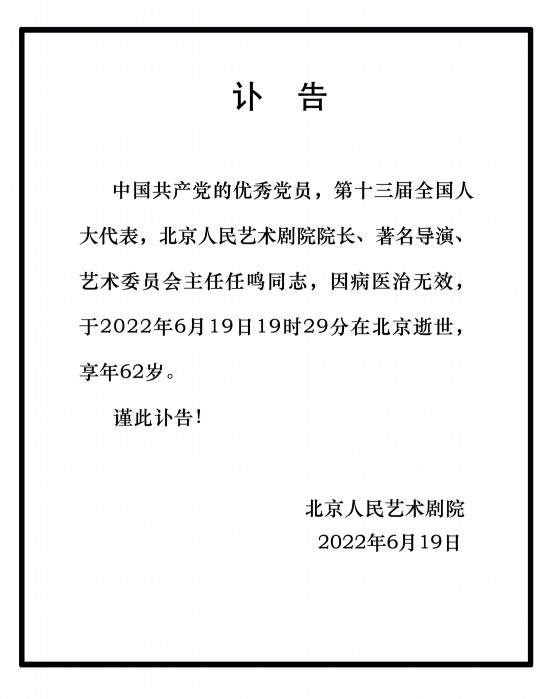 北京人民藝術(shù)劇院發(fā)布訃告:中國共產(chǎn)黨的優(yōu)秀黨員,第十三屆全國人大代表,北京人民藝術(shù)劇院院長、著名導(dǎo)演、藝術(shù)委員會主任任鳴同志,因病醫(yī)治無效,于2022年6月19日19時29分在北京逝世,享年62歲。