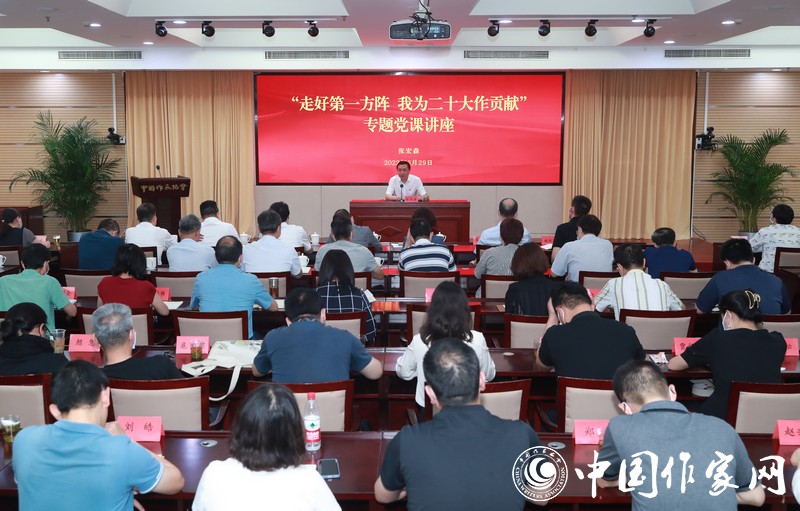 在“走好第一方陣 我為二十大作貢獻(xiàn)”的專題黨課上,張宏森以《走好第一方陣 綻放文學(xué)風(fēng)采 以實(shí)際行動(dòng)迎接服務(wù)黨的二十大勝利召開》為題,對(duì)作協(xié)黨員干部如何“走好第一方陣”進(jìn)行深刻闡釋,提出明確要求。張宏森指出,今年,我們黨將召開二十大,這是在進(jìn)入全面建設(shè)社會(huì)主義現(xiàn)代化國家、向第二個(gè)百年奮斗目標(biāo)進(jìn)軍新征程上又一個(gè)重要的里程碑。迎接服務(wù)黨的二十大和學(xué)習(xí)貫徹黨的二十大精神,是今年黨和國家政治生活中的頭等大事,也是全黨工作的主線。中國作協(xié)作為貫徹落實(shí)黨的文藝路線方針政策、作為貫徹落實(shí)習(xí)近平總書記關(guān)于文藝工作重要論述和指示批示精神的“第一棒”,是具有鮮明政治屬性的人民團(tuán)體,是踐行“兩個(gè)維護(hù)”的第一方陣。我們要按照黨中央要求,不斷提高政治能力、加強(qiáng)政治歷練,把政治判斷力、政治領(lǐng)悟力、政治執(zhí)行力體現(xiàn)到履職盡責(zé)的實(shí)際行動(dòng)上,不斷增強(qiáng)作協(xié)組織政治性、先進(jìn)性、群眾性,扎扎實(shí)實(shí)走好踐行“兩個(gè)維護(hù)”和貫徹落實(shí)黨中央決策部署的“最先一公里”,努力營(yíng)造平穩(wěn)健康的經(jīng)濟(jì)環(huán)境、國泰民安的社會(huì)環(huán)境、風(fēng)清氣正的政治環(huán)境,為黨的二十大勝利召開貢獻(xiàn)文學(xué)力量。
