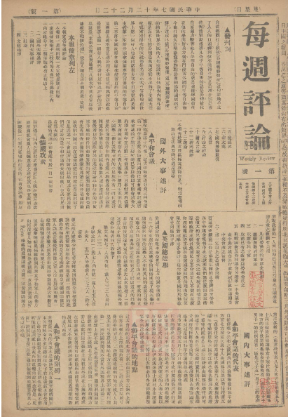 《每周評(píng)論》創(chuàng)刊號(hào)首頁(yè)