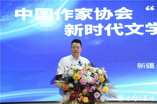 邱華棟在授牌儀式上講話。他表示,中國(guó)作家協(xié)會(huì)設(shè)立“深入生活、扎根人民”新時(shí)代文學(xué)實(shí)踐點(diǎn),就是要進(jìn)一步團(tuán)結(jié)引領(lǐng)廣大作家與人民同行、與時(shí)代同步,堅(jiān)持以人民為中心的創(chuàng)作導(dǎo)向,鼓勵(lì)廣大作家把“深入生活、扎根人民”作為長(zhǎng)期自覺的行動(dòng),進(jìn)一步推動(dòng)“深入生活、扎根人民”新時(shí)代文學(xué)主題實(shí)踐常態(tài)化、長(zhǎng)效化,推動(dòng)新時(shí)代文學(xué)繁榮發(fā)展。同時(shí),這次文學(xué)實(shí)踐點(diǎn)掛牌活動(dòng)也是中國(guó)作協(xié)堅(jiān)持以鑄牢中華民族共同體意識(shí)為主線,全力推進(jìn)“文化潤(rùn)疆”工程的重要舉措。