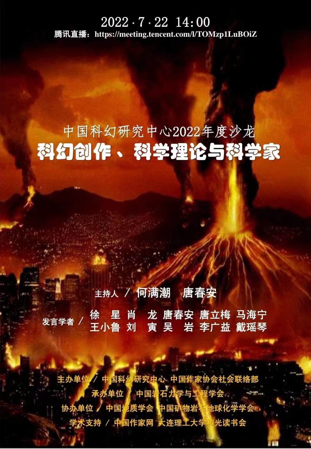 7月22日,中國科幻研究中心2022年度沙龍活動之一“科幻創(chuàng)作、科學理論與科學家”以騰訊會議的方式舉行。此次沙龍活動由中國科幻研究中心、中國作家協(xié)會社會聯(lián)絡(luò)部主辦,中國巖石力學與工程學會承辦,中國地質(zhì)學會、中國礦物巖石地球化學學會協(xié)辦,中國作家網(wǎng)和大連理工大學和光讀書會提供學術(shù)支持。