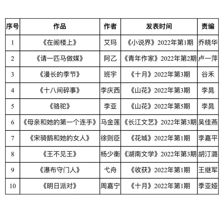 綜合2022年1月至6月每期推薦的所有作品,經(jīng)評審團(tuán)再次推選、評議并投票,中國作家網(wǎng)“優(yōu)選中短篇”半年榜出爐,以下為最終入選的十部作品(排名以作者姓氏拼音為序)。