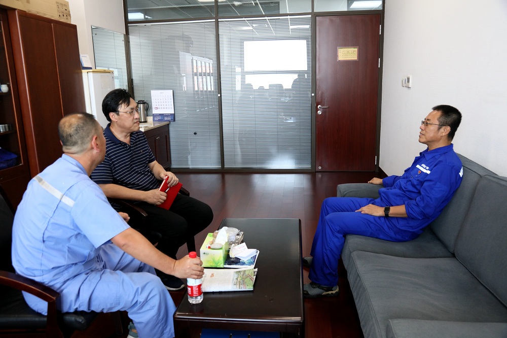 2022年7月25日下午,作家于永鐸采訪大連船舶重工集團(tuán)副總工程師姜福茂,了解了大連船舶重工集團(tuán)始終以科技為本,組織科研人員努力攻關(guān)諸如節(jié)能減排、無(wú)人駕駛等未來(lái)概念型船舶設(shè)計(jì)難題,引領(lǐng)國(guó)內(nèi)船舶制造行業(yè)走向輝煌。圖為采訪現(xiàn)場(chǎng)。