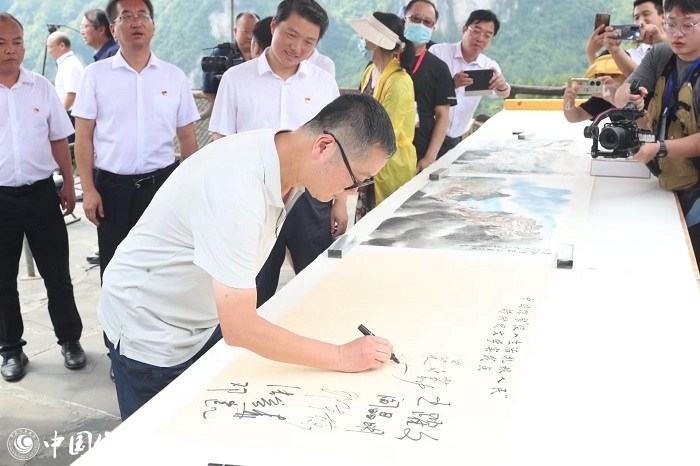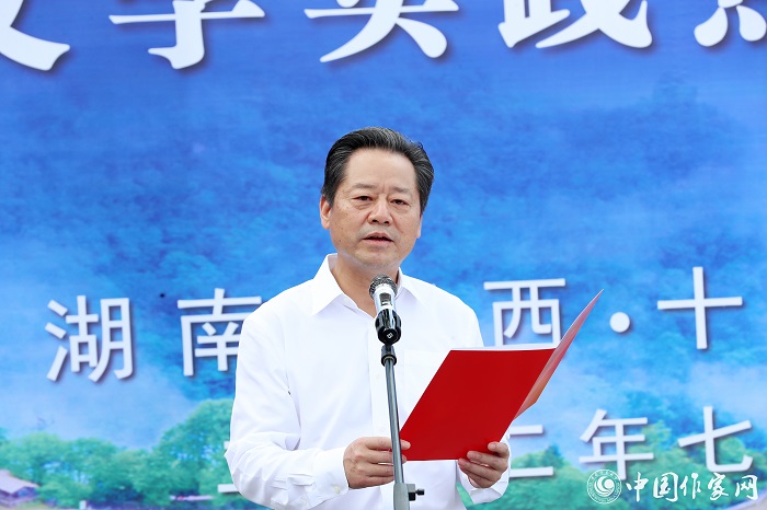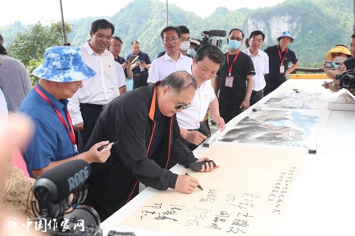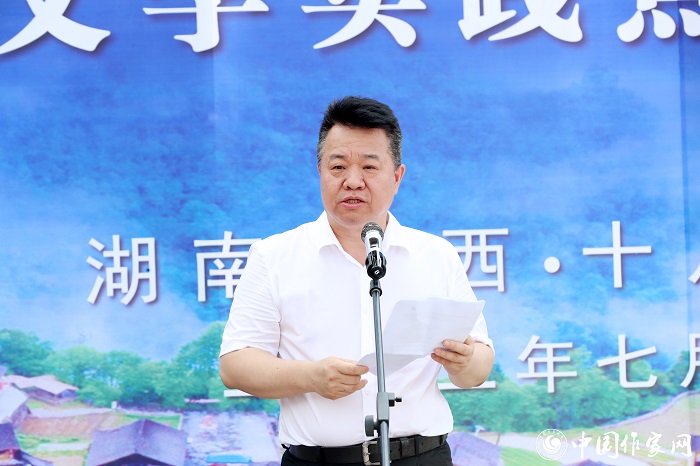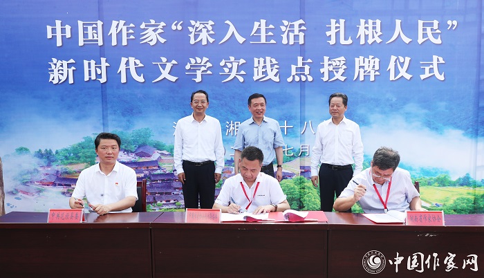 中國作協(xié)主席團(tuán)委員、書記處書記邱華棟為中國作家“深入生活、扎根人民”新時代文學(xué)實踐點授牌,湘西州州委書記虢正貴接牌