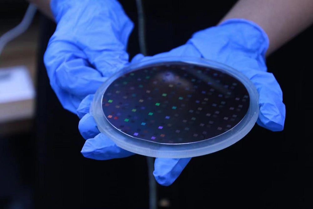 2022年7月25日,曹凌云(左)在中電???溫州光電產(chǎn)業(yè)創(chuàng)新聯(lián)合體光電材料與器件應(yīng)用實驗室了解情況。